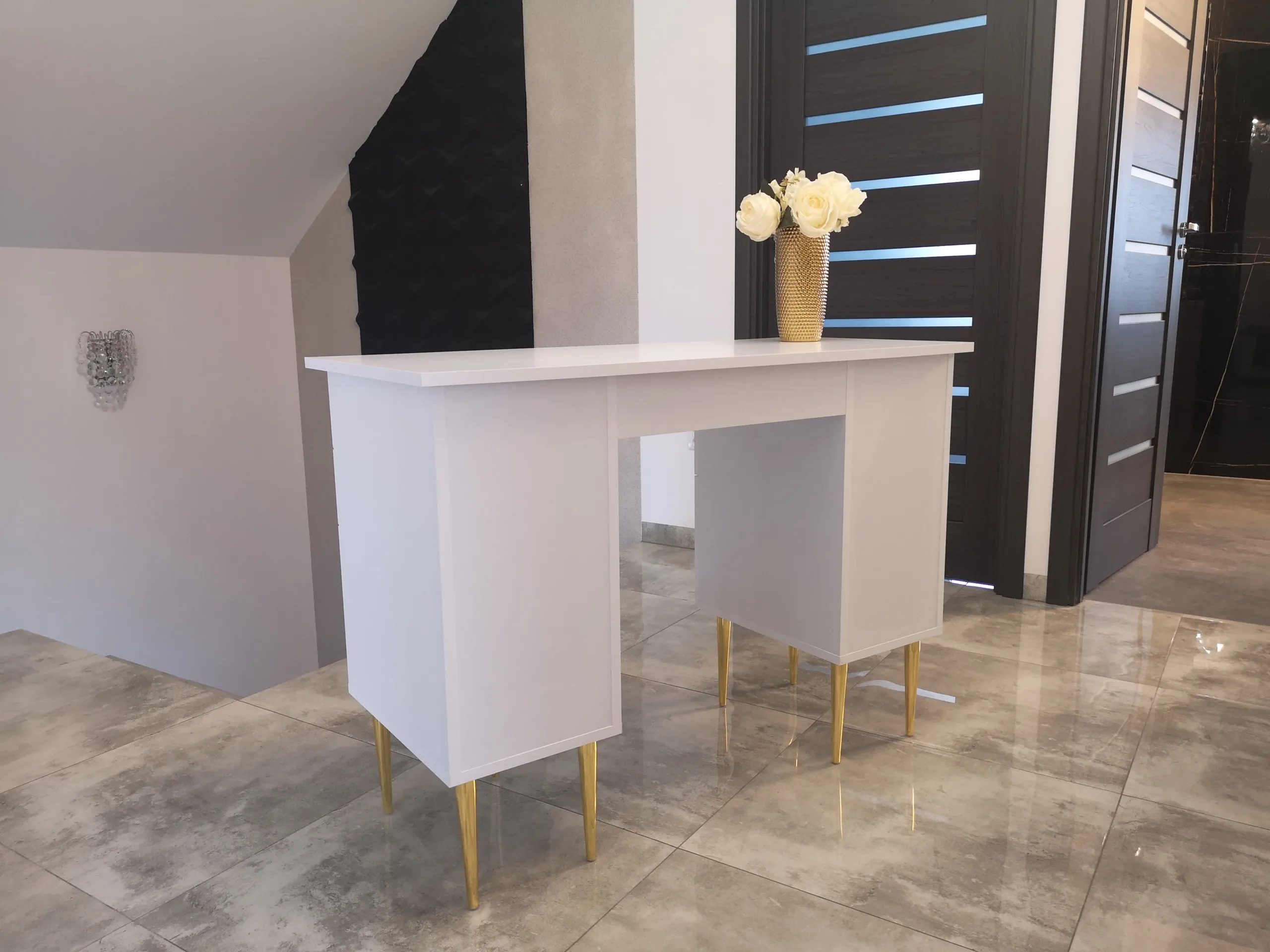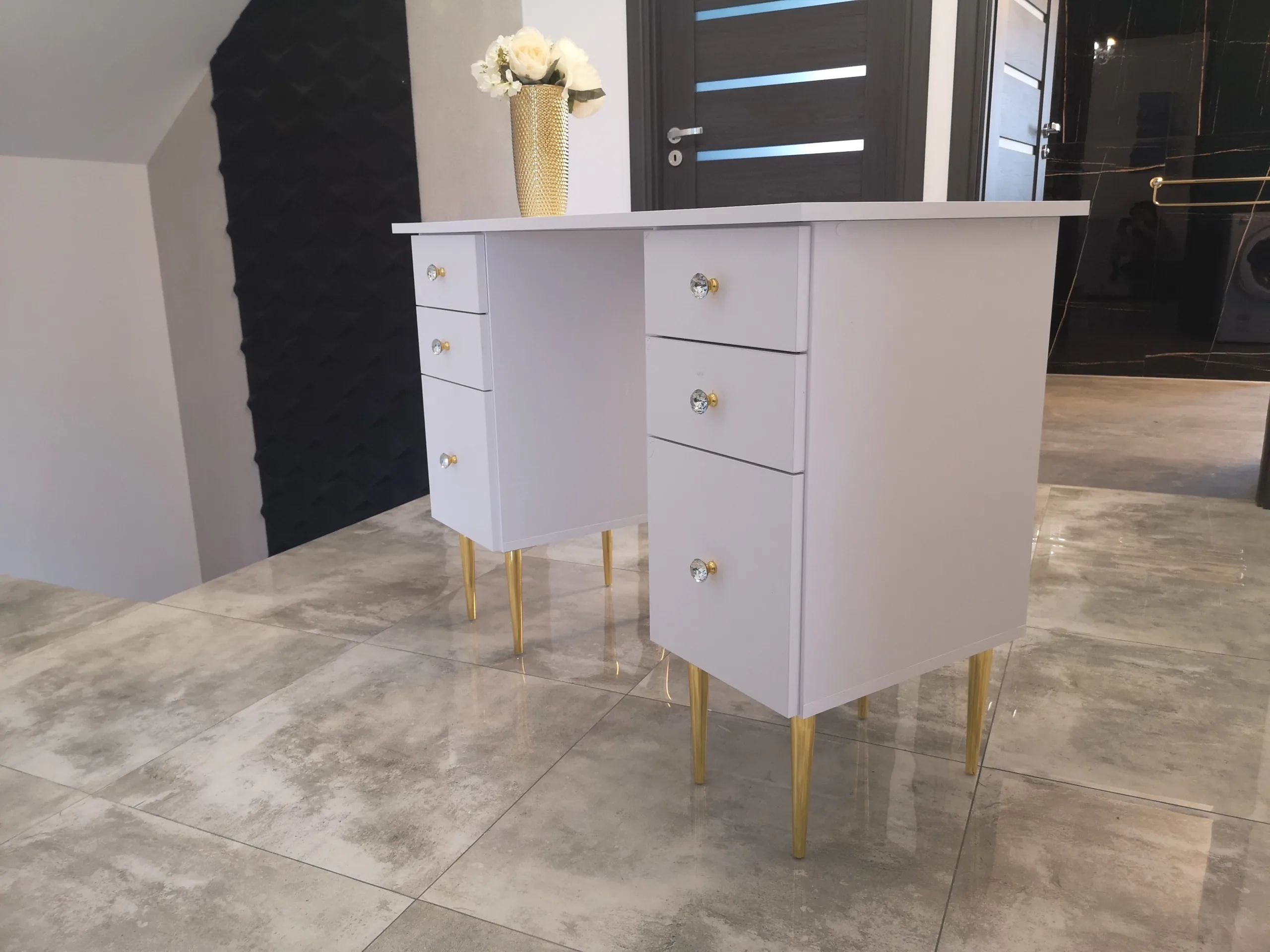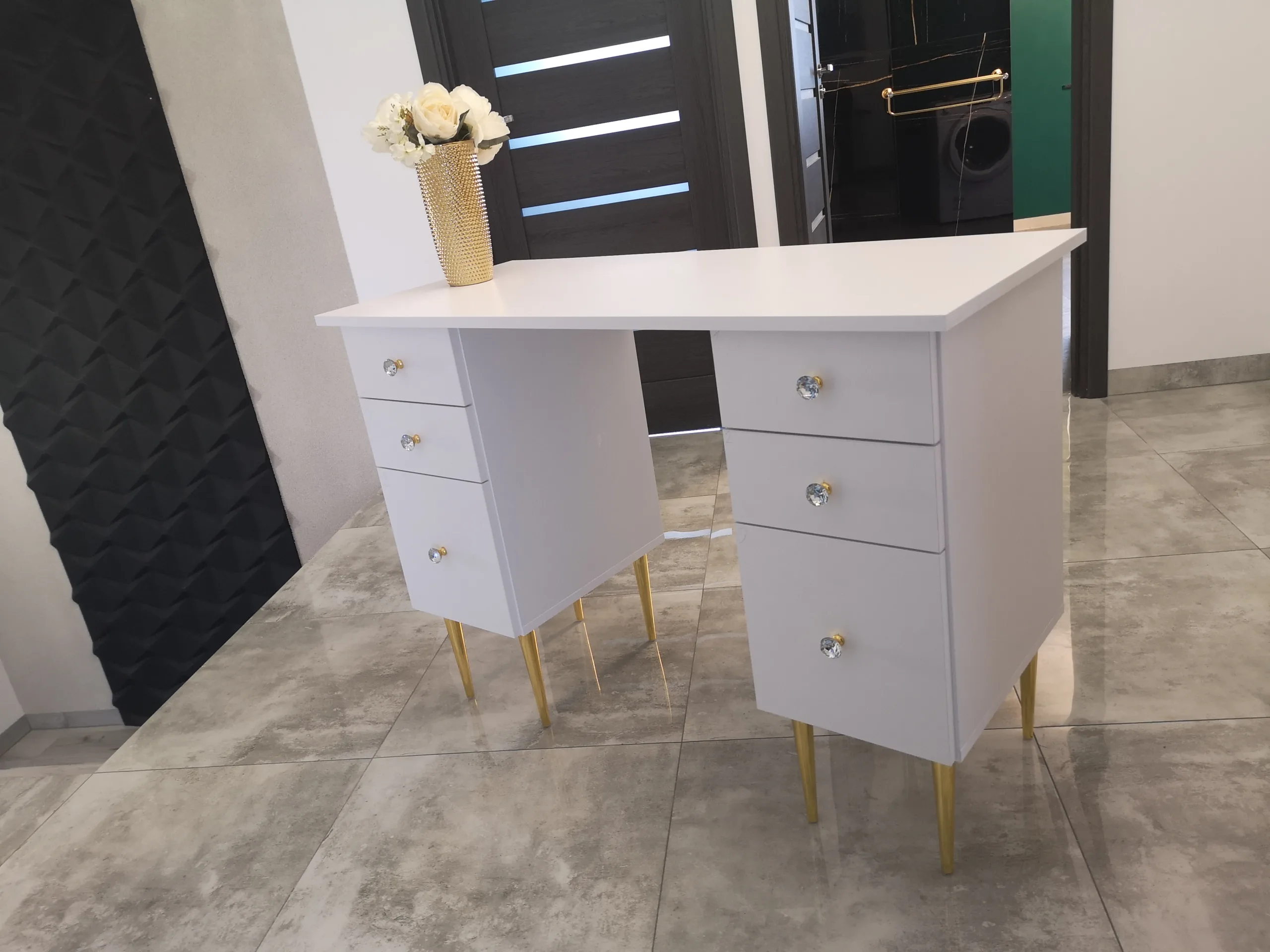 Biurko do manicure na złotych lub czarnych nóżkach z kryształowymi uchwytami w złotej lub srebrnej oprawie.