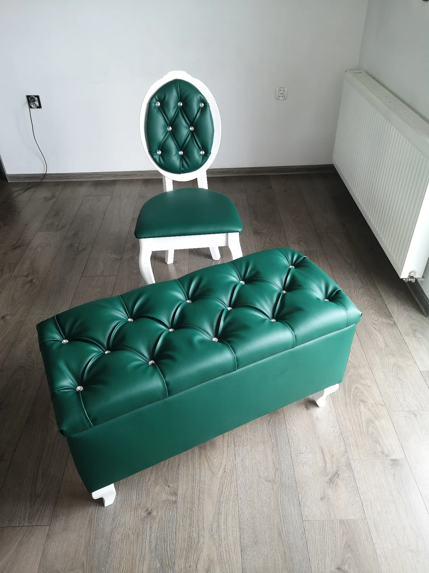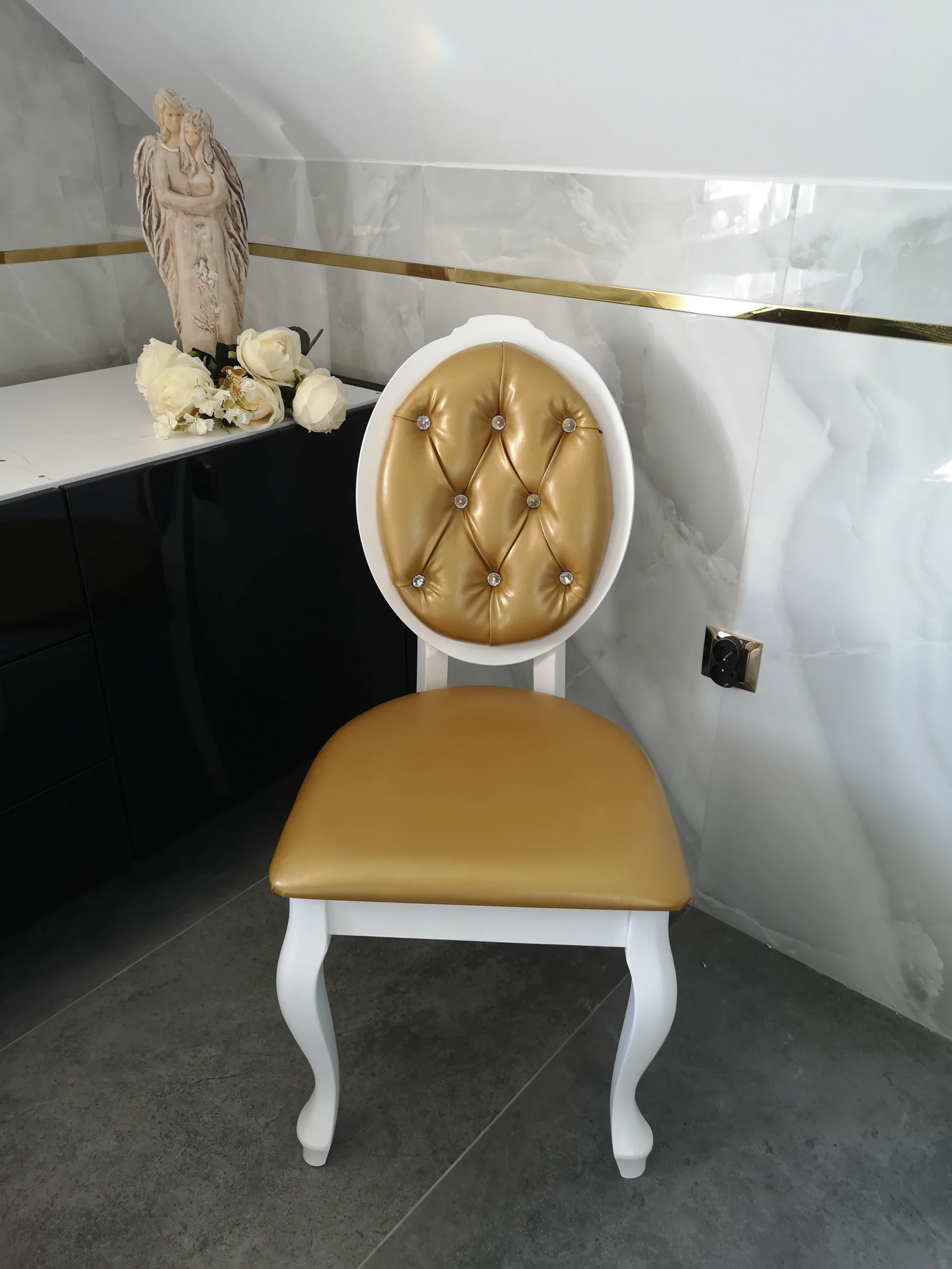 Krzesła ozdobione są kryształkami. Dowolny kolor obicia.