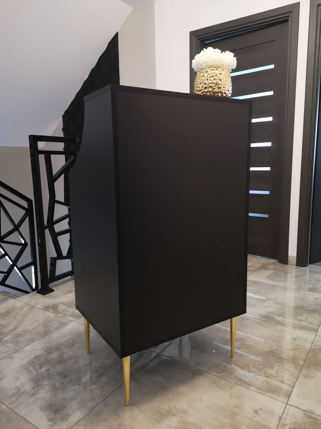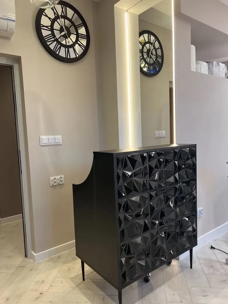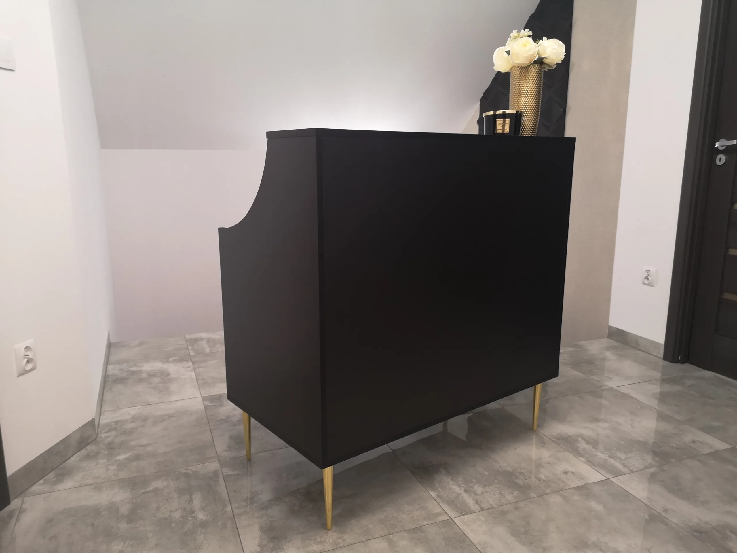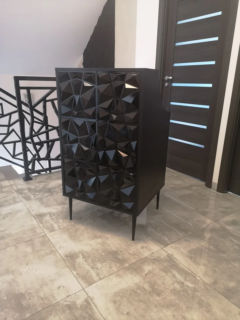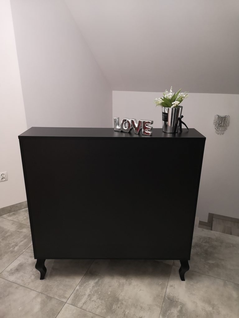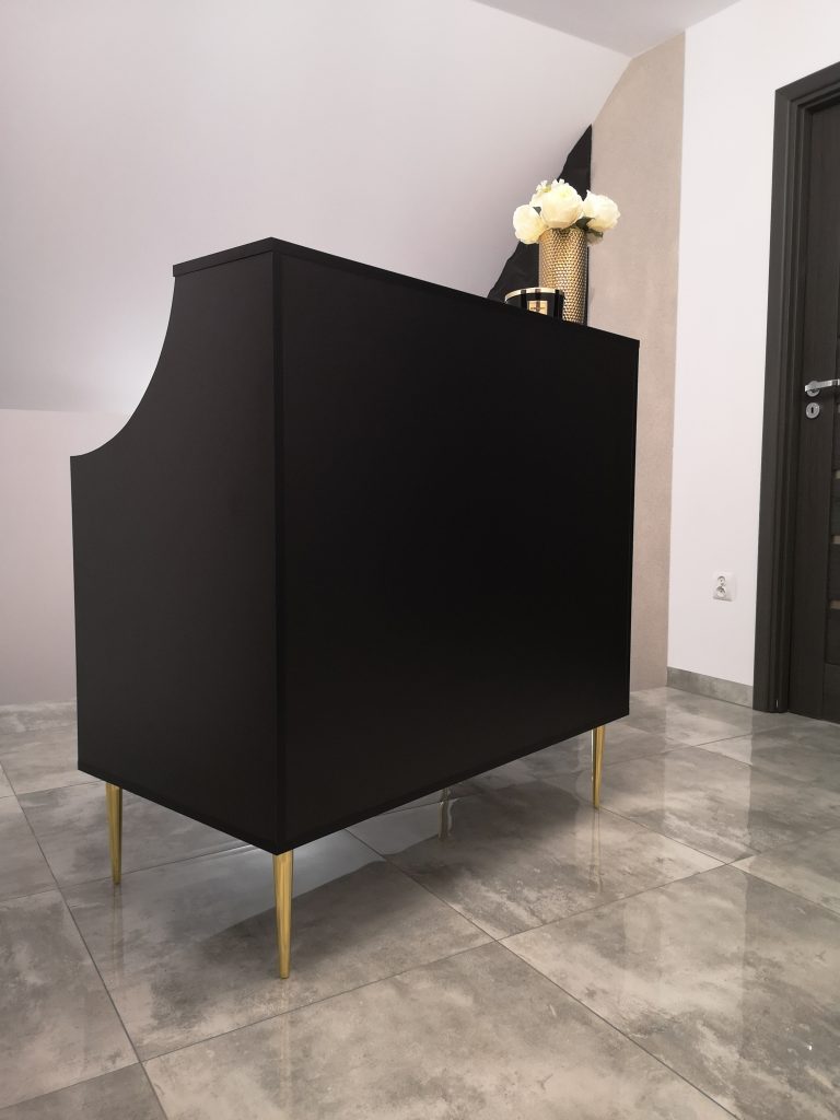 Uzupełnieniem wyposażenia są czarne komody, meble pomocnicze oraz czarne sofy, czrane fotele wykonywane na zamówienie.