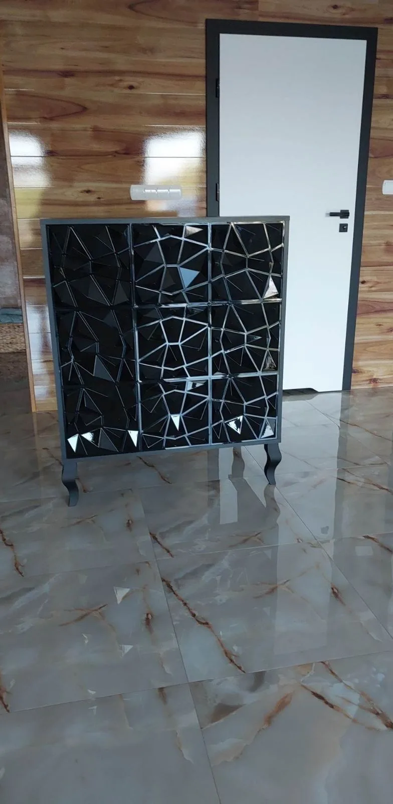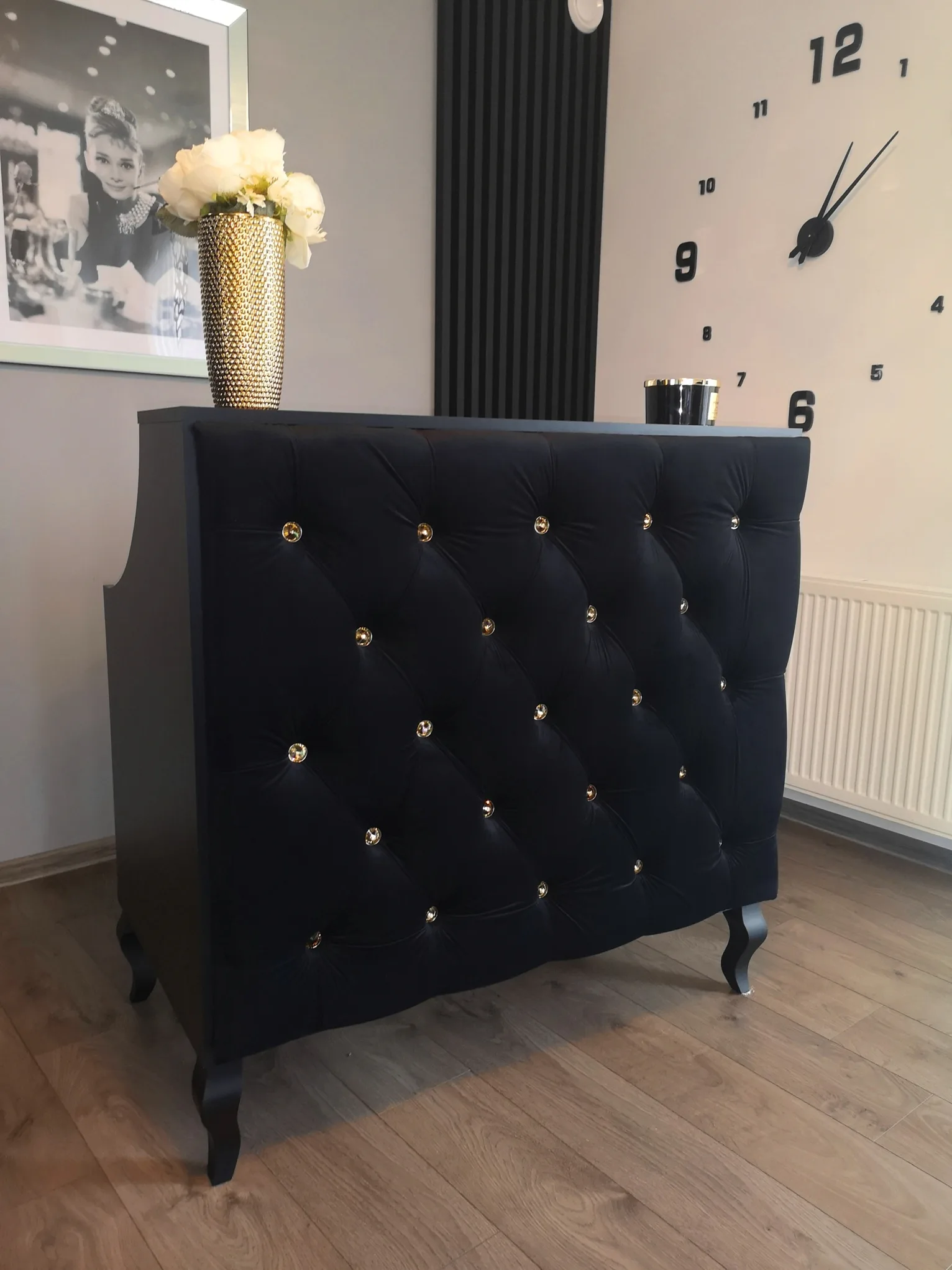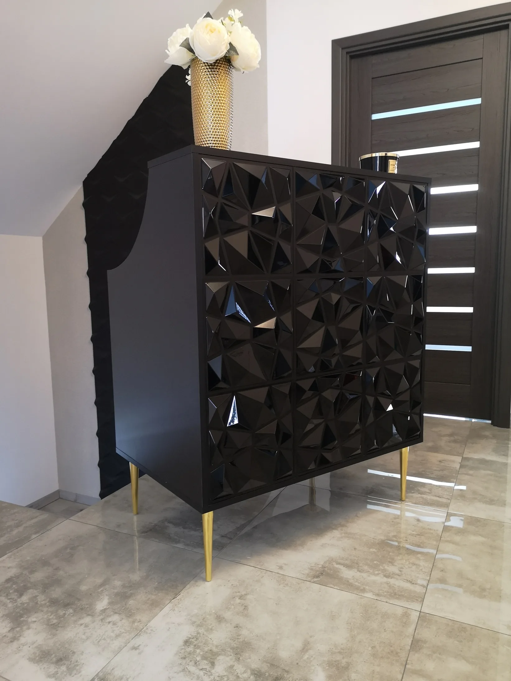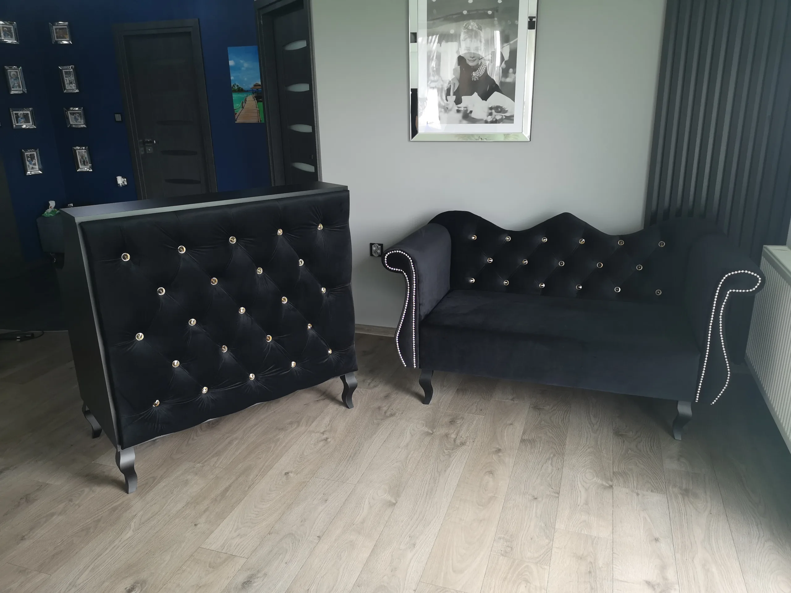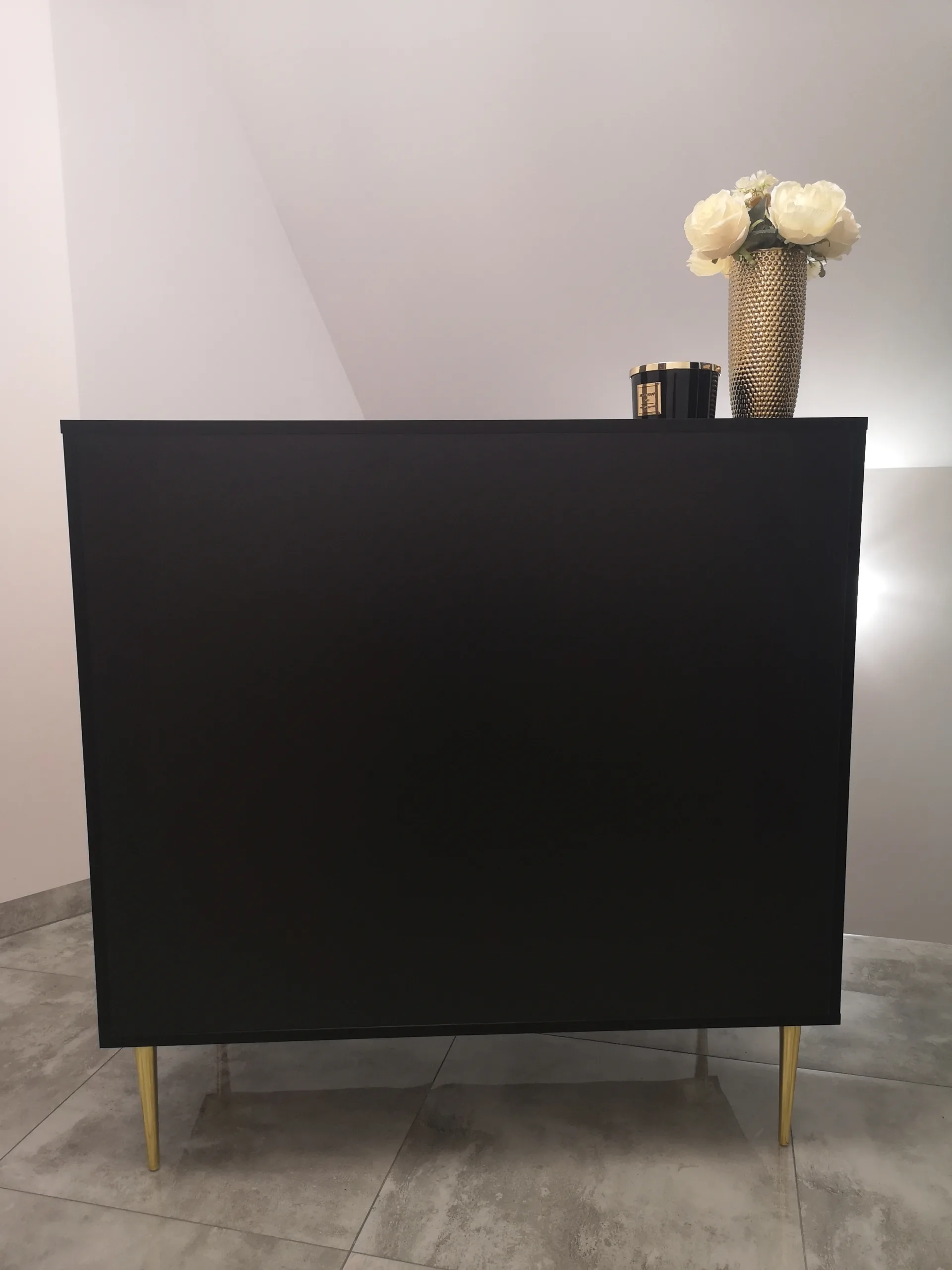Uzupełnieniem wyposażenia są czarne komody, meble pomocnicze oraz czarne sofy, czrane fotele wykonywane na zamówienie.
