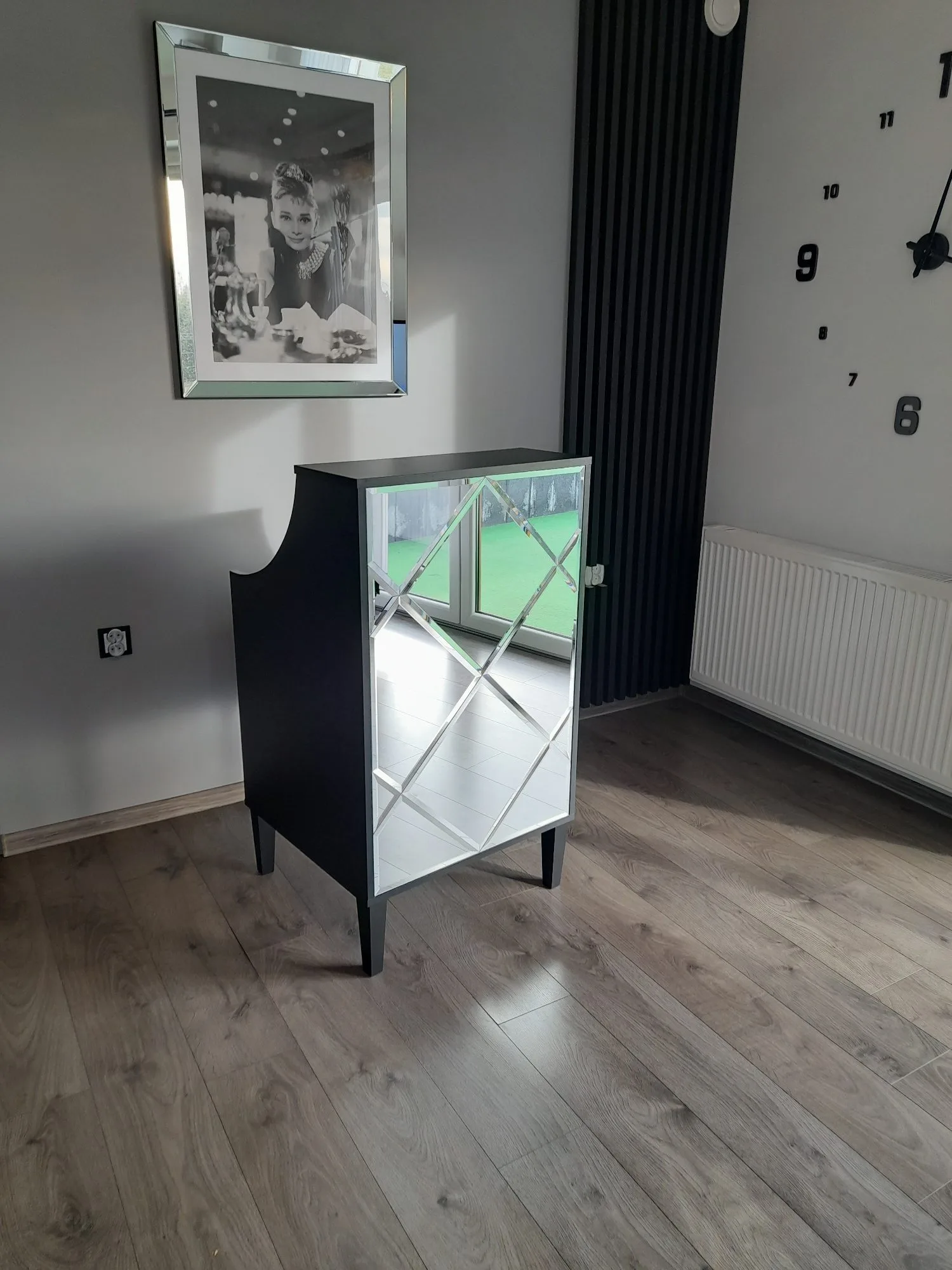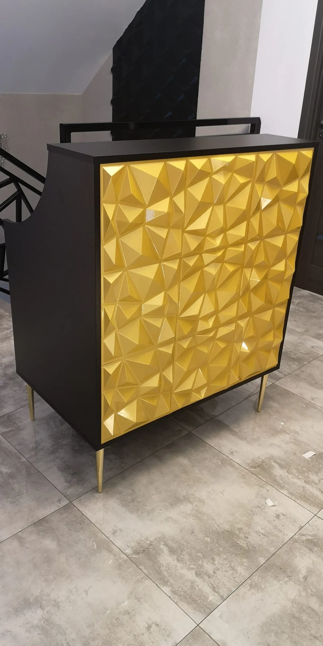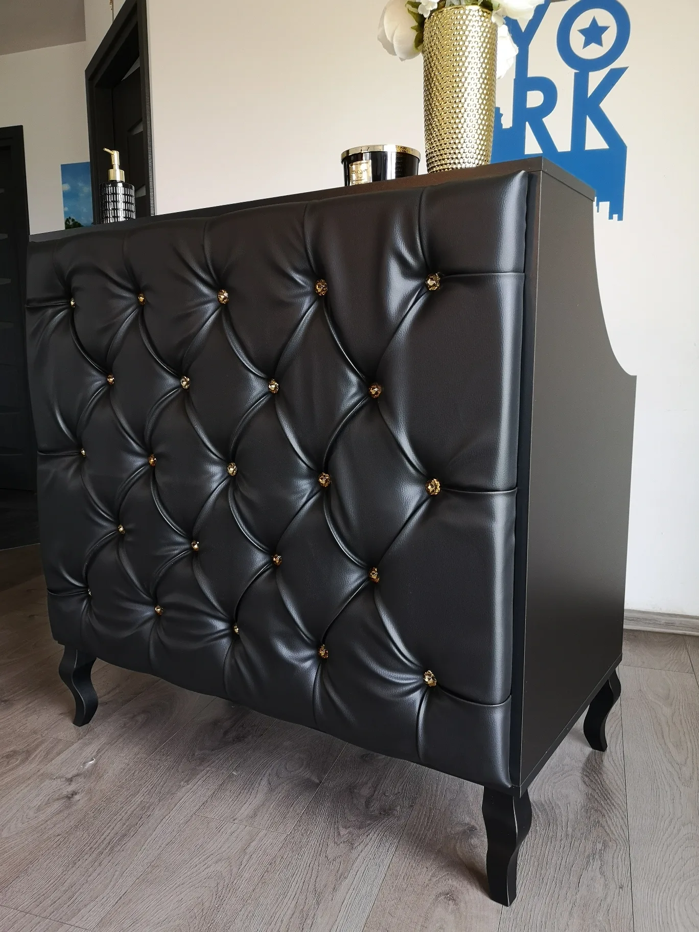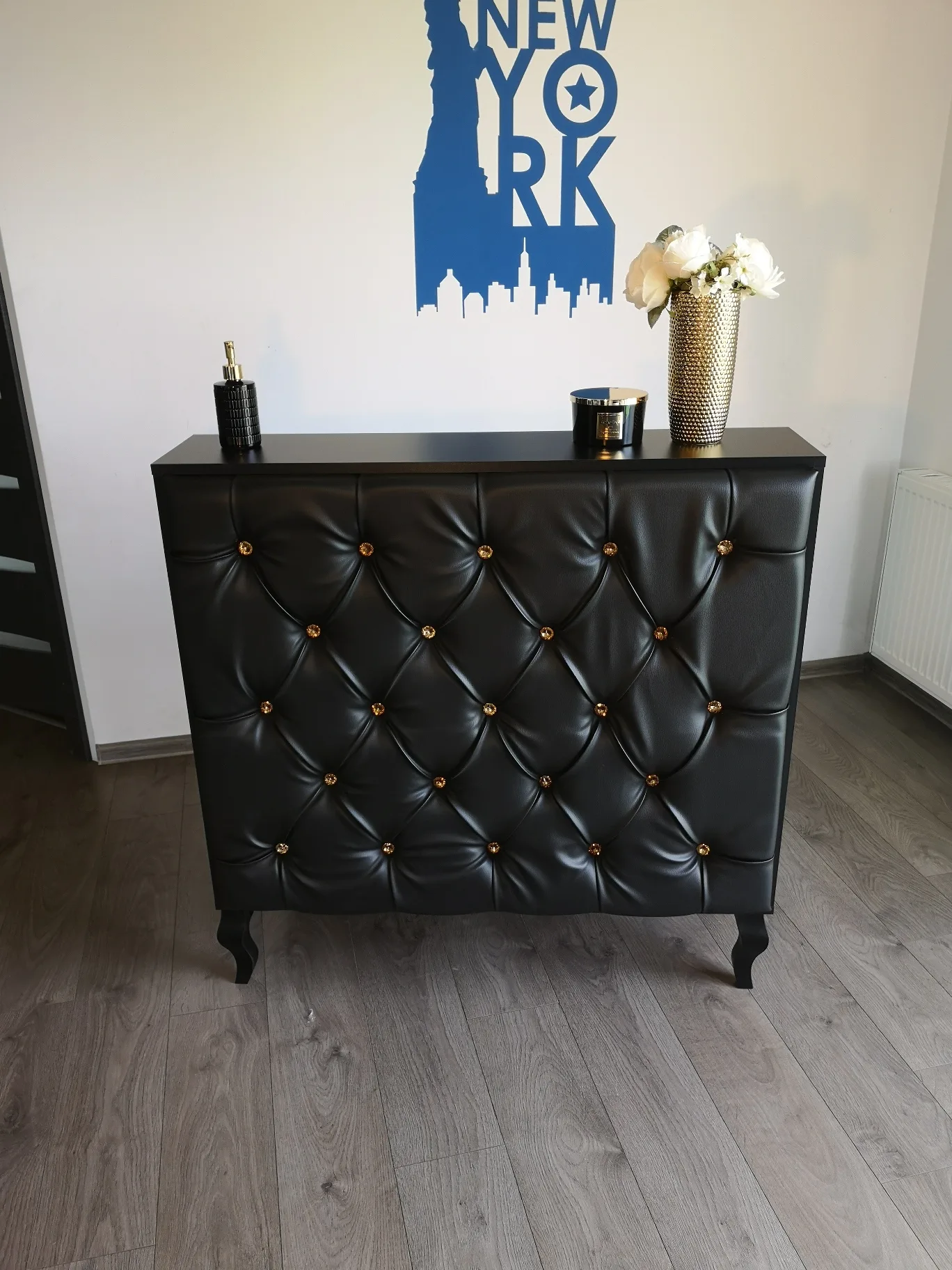 Uzupełnieniem wyposażenia są czarne komody, meble pomocnicze oraz czarne sofy, czrane fotele wykonywane na zamówienie.