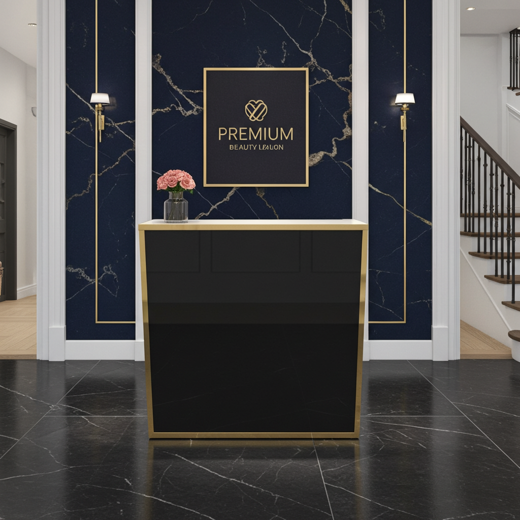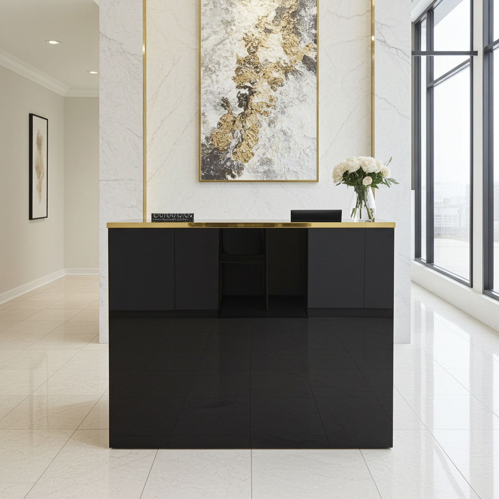 Czrana recepcja to pierwszy element, który widzi klient wchodząc do salonu. Oferujemy czarne recepcje i lady recepcyjne, które łączą nowoczesny wygląd z funkcjonalnościa biurka recepcjonistki. W zależności od potrzeb recepcje mogą być wykonane w wersji mini lub pełnowymiarowej, z nadstawką, wnęką na krzesło (recepcja-biurko), szafkami oraz przelotkami na kable.