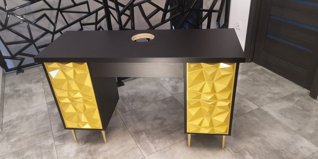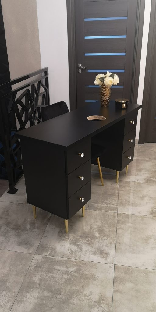 Wykonujemy czarne biurka kosmetyczne, które sprawdzają się przy stylizacji paznokci w salonie kosmetycznym. Biurka mogą być dostosowane do prac jednej lub dwóch stylistek. W ofercie posiadamy jednostanowiskowe biurka kosmetyczne oraz dwustanowiskowe biurka kosmetyczne.